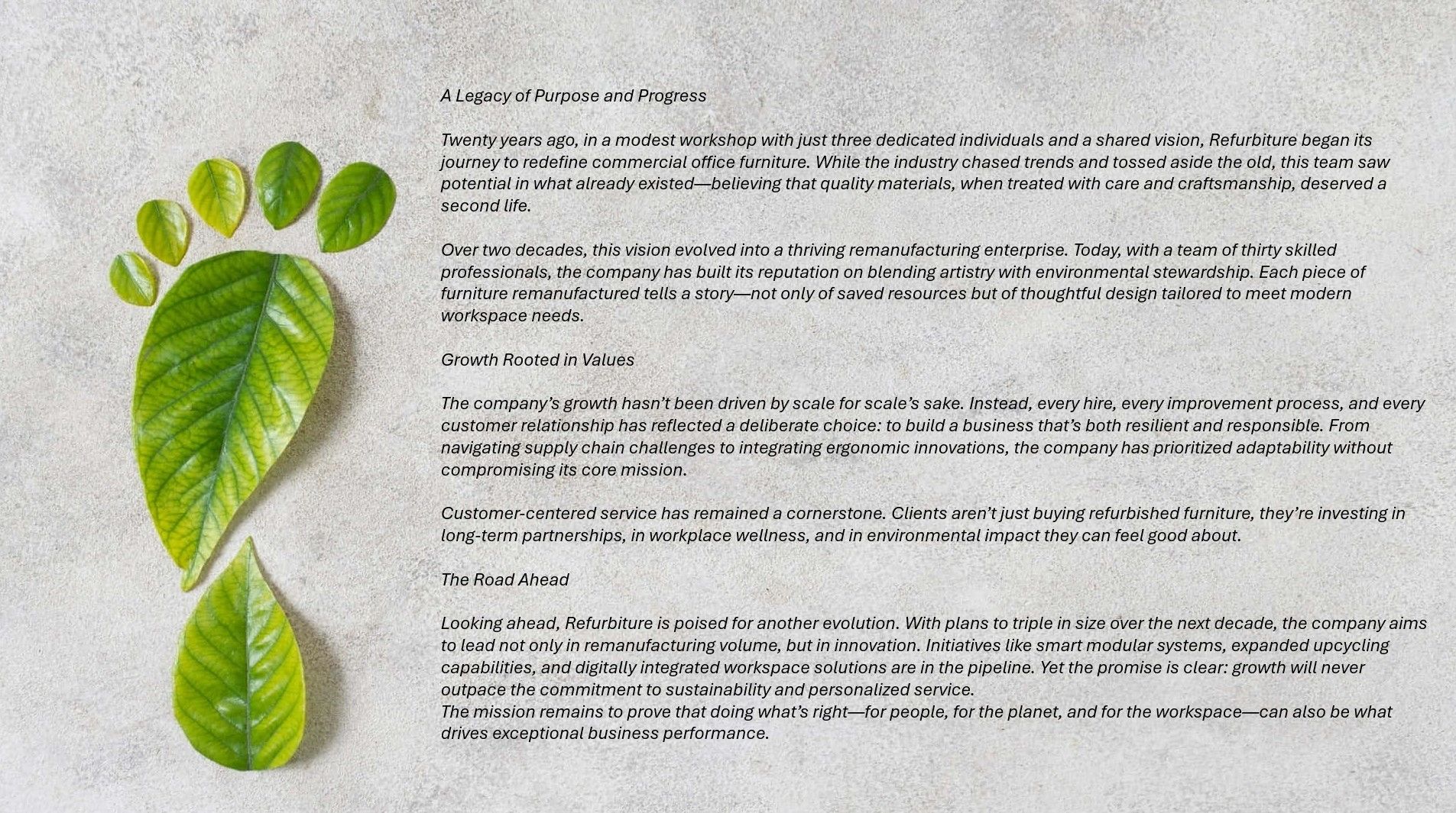 At Refurbiture, we are passionate about helping businesses with sustainability initatives. Our team started the company in 2005 with a mission to provide high-quality remanufactured office furniture and exceptional service to our customers.